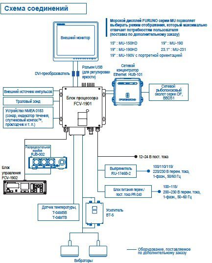 - Вывод положения эхосигналов и другой информации на подключенный карт плоттер